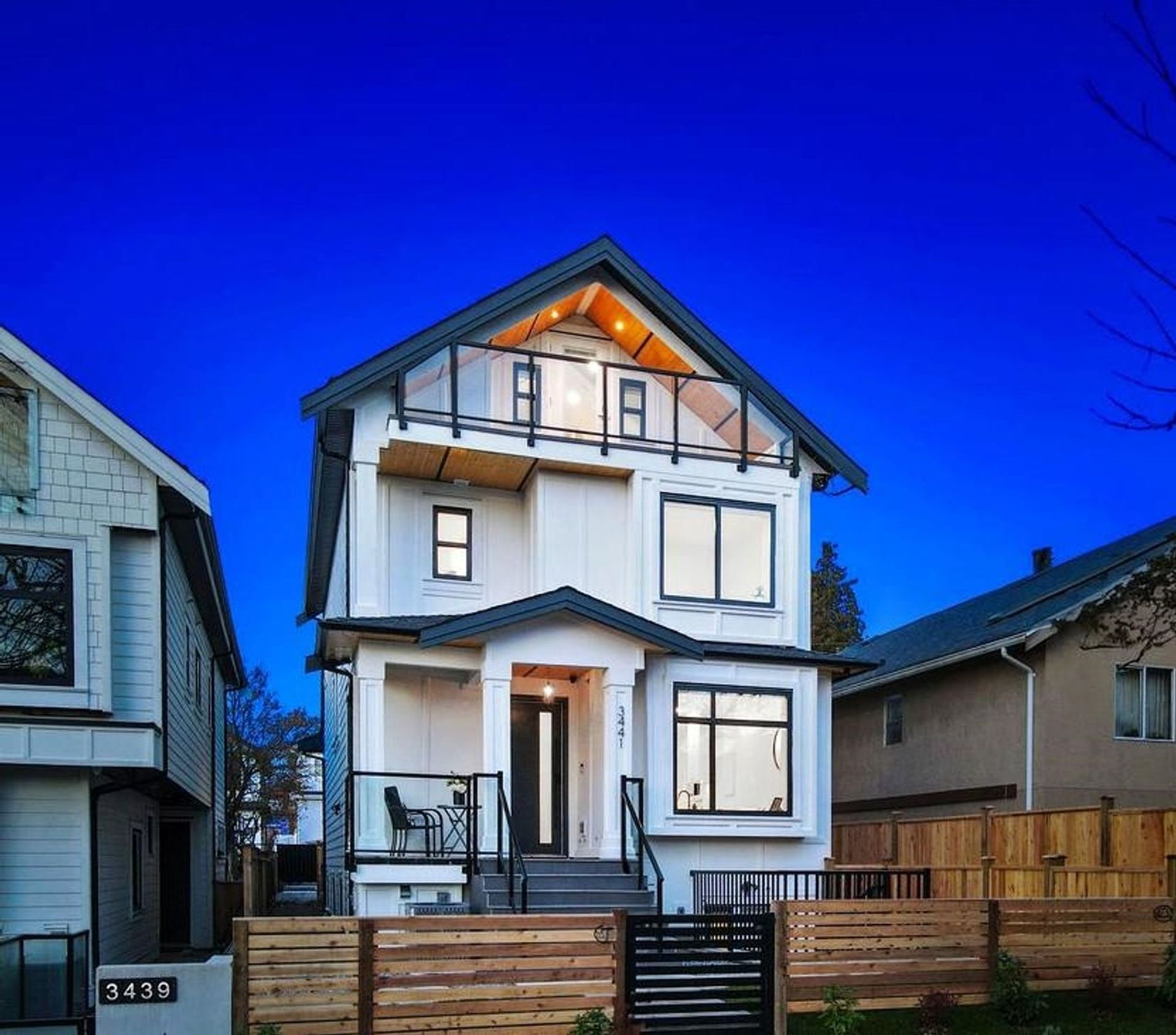Welcome to 3443 Franklin Street! Beautiful new back unit 4 LEVEL duplex home with total 5 BED + 4 BATH, featuring a 2 BED rental mortgage helper suite below! Located in the Hastings Sunrise area, this approx 1,600 SF home is designed with comfort in mind. Main floor features a functional family area and kitchen complete with integrated appliances, custom cabinetry, bar area, and entertainment built in with fireplace. Home is equipped with A/C, HRV, built in speakers, security cameras, EV car charger and more! Large private walk out backyard with covered patio area perfect for entertaining. Great value price/sqft for this home! Beautiful family neighborhood close to bus loop transit, schools, highway #1, PNE, downtown, and local restaurants and shopping!