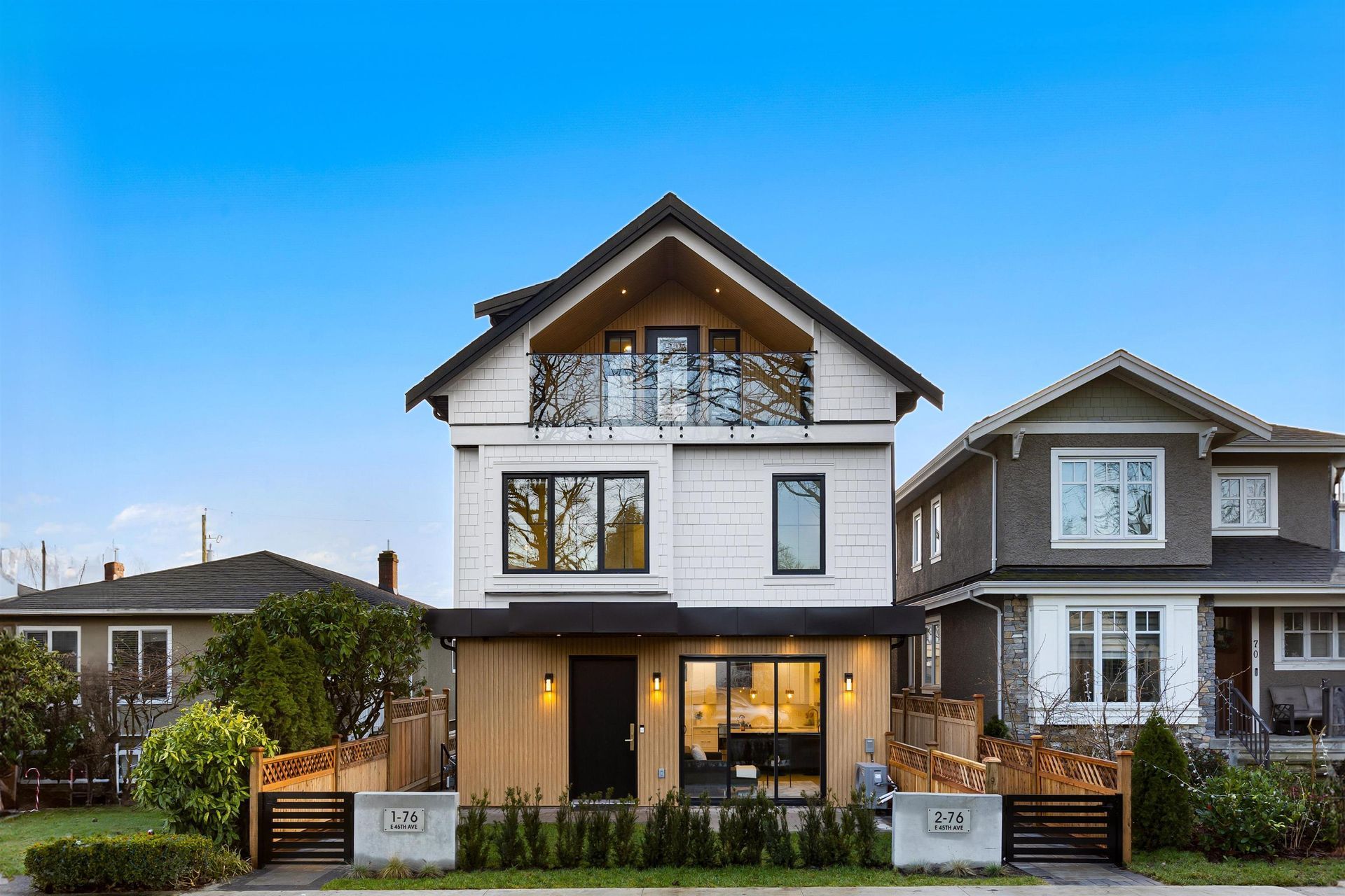 Discover E 45th Duplex Collection! Beautifully crafted back unit duplex offering 3 bed 4 bath open concept living floor plan. Premium millwork, design package + elegant finishing built with attention to detail + functionality in mind. Family-friendly neighborhood west of Main St with an urban farmhouse style that offers warm and inviting spaces from the moment you step inside. Spacious kitchen is complete with Fisher-Paykel integrated appliances package + custom cabinetry which opens off the dining room to your landscaped private patio + backyard. Engineered hardwood flooring, A/C heat pump, security systems, radiant floor heating + single car garage with EV parking. Easy access to schools, amenities, Oakridge Park Mall, quick drive to DT + YVR.
