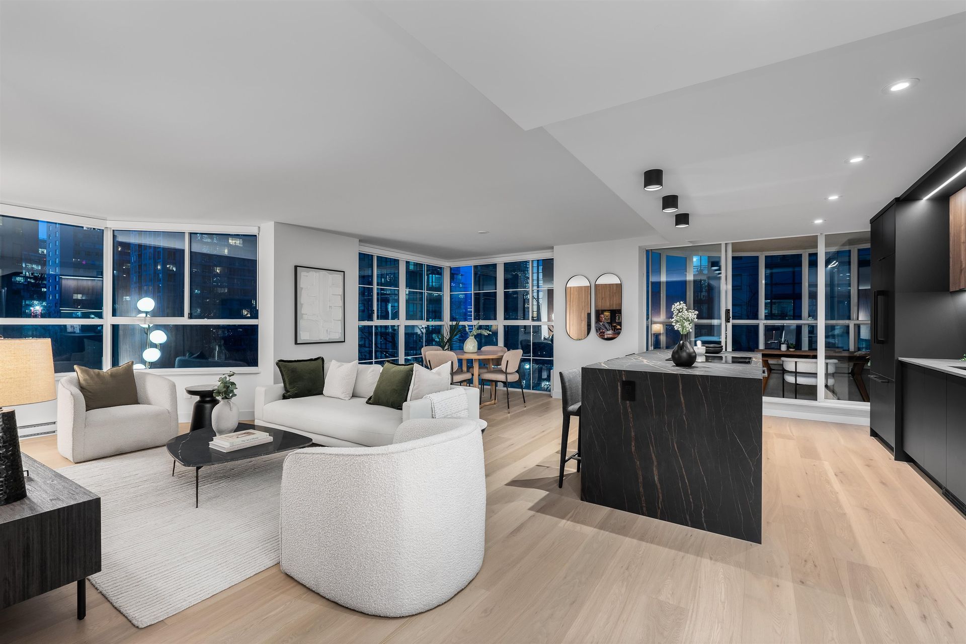 Discover unparalleled luxury living in this extensively renovated modern two bedroom + den, two bathroom condo just steps to downtown's finest restaurants and boutique shops, English Bay, Stanley Park, and the Coal Harbour Marina. Extensively renovated and re-designed by Vancouver’s award-winning Designs by KS, this spacious residence features an open-concept layout with exquisite design and luxurious finishes throughout. Luxury Features include: custom millwork wood paneling, chic matte porcelain kitchen countertops, Fisher & Paykel appliances, sleek cabinetry and storage, and ambient mood lighting. Emerald West offers excellent building amenities - including an indoor pool, sauna, hot tub, gym, and concierge.