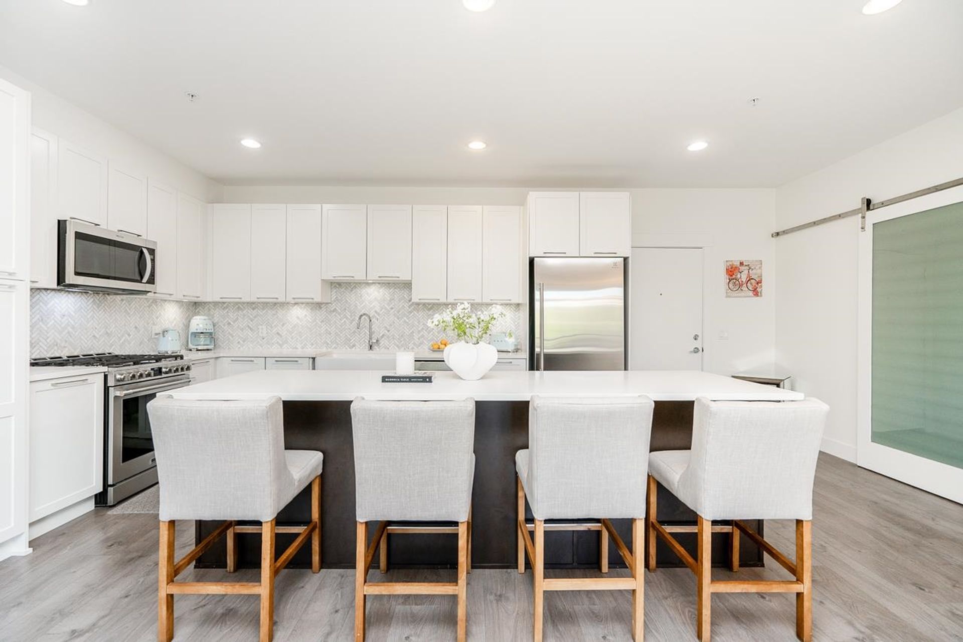 Welcome to The Belmont – Murrayville’s premier condo community by award-winning Infinity Properties. This spacious 1,550 sq.ft. 2 bed + den home features a smart layout and a 289 sq.ft. covered patio with gas hookup overlooking Memorial Park. Enjoy 9 ft ceilings, large windows, and a bright kitchen with a custom farmhouse sink, herringbone backsplash, quartz counters, oversized island, gas range, & high-end appliances. The primary suite offers a 5-piece ensuite, massive walk-in closet, and patio access. The second bedroom also opens to the patio with dual closets and cheater access to the 4-piece bath. Includes A/C, 2 side-by-side parking stalls, and a welcoming, well-maintained building. Just steps to shops, dining, Blair Rec Centre, and Langley Memorial Hospital.