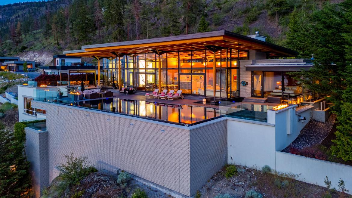 The sun terrace, accessible from the great room and primary suite, offers stunning 180-degree lake views and romantic sunsets. Wider than the home itself, the terrace includes multiple outdoor lounge areas, an outdoor kitchen, numerous gas-lit fire features, and a pool deck that seamlessly flows into an infinity pool color-matched to Okanagan Lake.