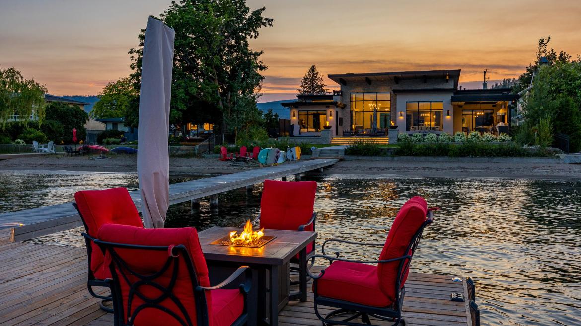 AWARD WINNING WATERFRONT. This private, custom-built residence received accolades at the 2023 CHBA National Awards for Housing Excellence, celebrated as one of Canada’s finest detached custom homes. Single-story living is highlighted by soaring 19-foot ceilings and oversized windows. Wide plank white-washed oak hardwood, herringbone oak doors, and custom metal doors enhance its aesthetic appeal. A chef's kitchen features perfectly positioned lake views, complemented by high-end Miele appliances and a spacious pantry that can be converted into a temperature-controlled wine room. The primary bedroom offers another breathtaking lakeview, a luxurious ensuite, and an adjacent gym filled with natural light. Two additional ensuite bedrooms on the other side of the home provide privacy for children or guests. Indoor space seamlessly transitions to a level backyard overlooking Okanagan Lake. Outdoor amenities include a gourmet kitchen with a privacy-screened louvered pergola, gas fire bowls, and a newly expanded dock equipped with a 14,000 pound boat lift. Automotive aficionados will appreciate the main garage, which includes a 9,000 pound lift. A single garage is perfect for storing motorcycles, bikes, and water toys. Located amidst stunning landscapes characterized by its vineyards and mountains, this home is surrounded by numerous award-winning wineries that showcase the unique terroir and flavors of the celebrated Okanagan Valley wines. Truly luxury waterfront living in a private oasis.