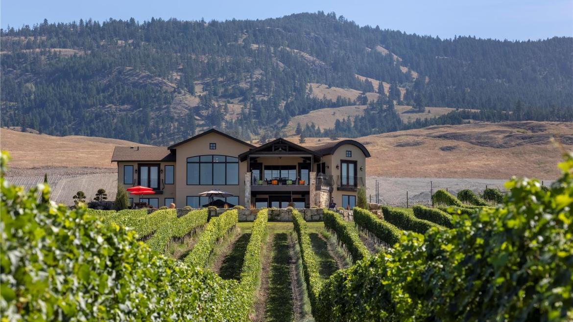 This vineyard estate features a custom-built home meticulously situated to capture a stunning, panoramic view of the valley. The lake stretches below, rolling hills and mountains in every direction, and at night the city lights come to life.